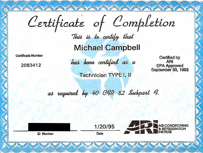 EPA Refrigerant Handling Certification - The Federal Government of the United States requires all individuals who open a system or container holding a controlled refrigerant to be certified. Congress gave authority to the Environmental Protection Agency (EPA) to write the necessary regulations to implement the rulings in Section 608 of the Clean Air Act. Persons who work on stationary equipment or use refrigerant designed for these systems can become certified by passing a proctored Section 608 examination.